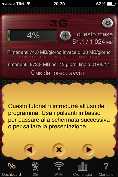 In sede di avvio verrete guidati nelle varie modalità di utilizzo dal tutorial automatico, completata tale fase sarete condotti alla dashboard di gestione col contatore principale dove poter monitorare le percentuali di avanzamento dei consumi, sulla base dei limiti impostati tramite gli appositi tasti di regolazione, oltre che alla sintesi di consumo nel periodo indicato. L’accesso alle singole voci di controllo ed ai settings è consentito agevolmente dalla barra inferiore dove sono disposte le 5 icone di base per l’accesso ai dati inerenti il 3G, la rete WiFi, la cronologia ed infine il manuale utente, per le istruzioni, ed il ritorno alla dashboard.